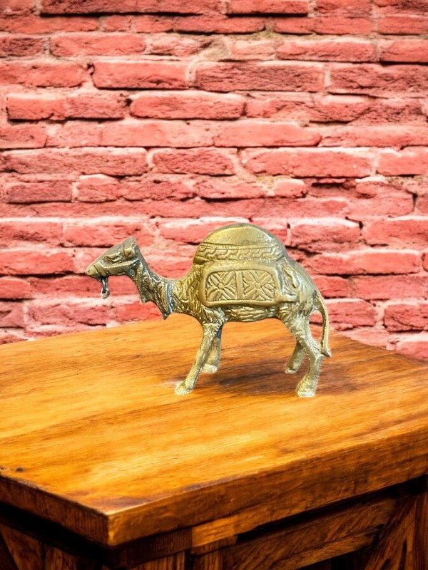 Bu pirinç deve figürü, doğal pirinç rengini koruyarak parlak veya hafif eskitme patinasıyla klasik bir görünüm sunar. Semer, boyun, baş kısımlarında kabartma desenler olabilir. Orta Doğu veya çöl temalı dekorlarda, hediyelik veya koleksiyonluk amaçla sıkça tercih edilir. Masif pirinç yapısı sayesinde dayanıklı ve ağırdır